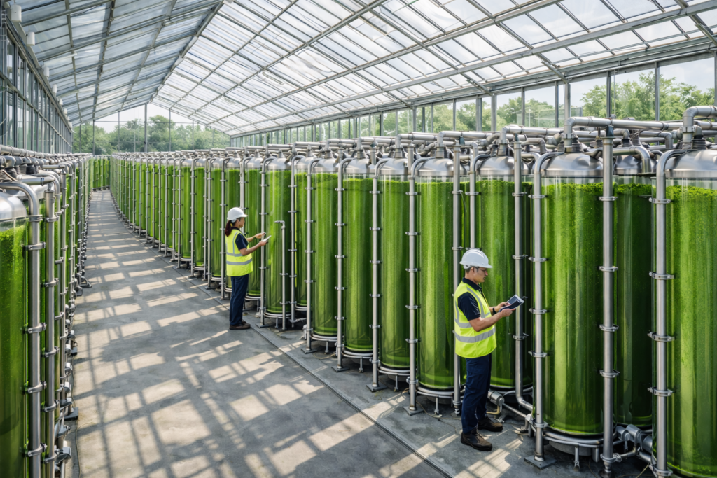 🌱 Das verbleibende CO₂ (z. B. aus Gasaufbereitung/Prozessströmen) wird in eine Algenfarm (Rohrsysteme im Gewächshaus) geleitet.